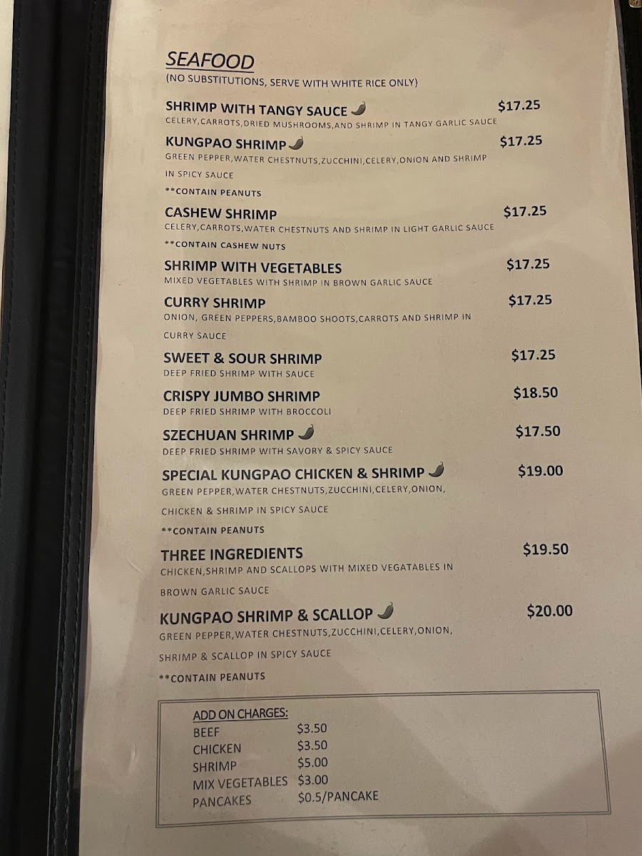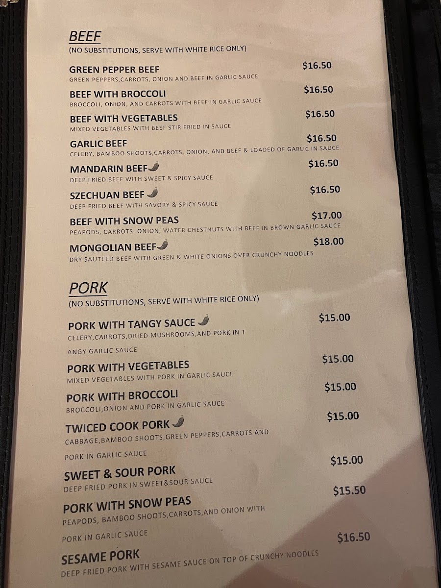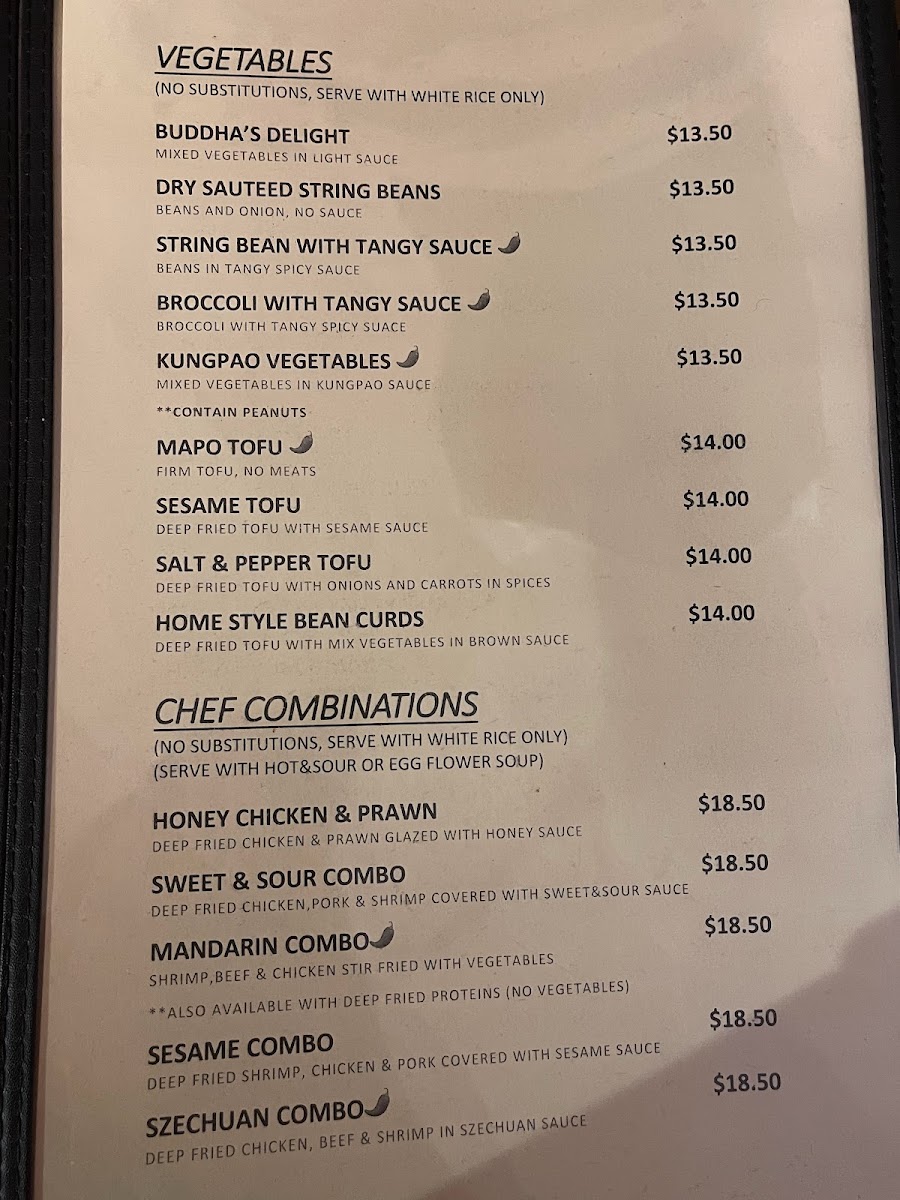 The menu features a variety of traditional and contemporary Chinese dishes divided into several key sections to cater to diverse tastes. The Chef Specialties include popular items such as General Tso’s Chicken, Orange Chicken (with a gluten-free option), and Sesame Chicken, all prepared with distinct sauces and seasonings.