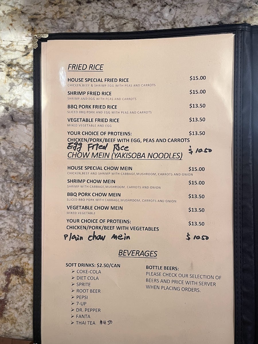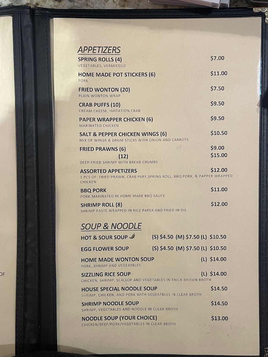 Additional menu highlights include soups like Hot and Sour Soup and Egg Flower Soup, appetizers such as Potstickers and Salt & Pepper Prawns, and various other dishes including Twice Cooked Pork, Chicken Egg Foo Young, and Dry Sauteed String Beans. The beverage selection includes traditional choices like Thai Tea.
